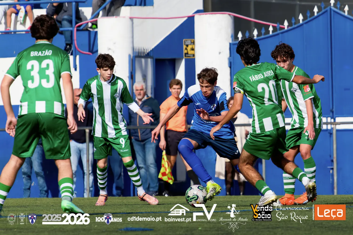 FESTA AZUL E BRANCA NO CAMPO 1.º MAIO! Os Juvenis Sub-17 “A” do CD 1.º de Maio fizeram explodir de alegria todo o Palheiro Ferreiro, Camacha, este domingo, 8 de fevereiro de 2026, ao vencerem o CD Ribeira Brava por 2-1, em jogo da 5.ª e última jornada da Série “A” da 1.ª fase do Torneio Intercalar Juvenis – Futebol 11.
