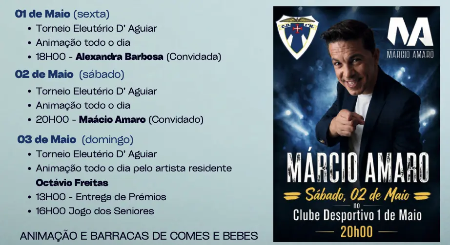 • 3 de maio: O dia começa às 13h00 com a entrega de prémios. À tarde, o recinto conta com a presença do artista residente Octávio Freitas e, pelas 16h00, a emoção muda-se para o relvado com o jogo dos nossos seniores.