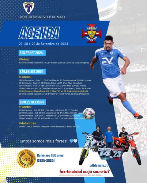 Futebol, Futsal e Ténis de Mesa em ação A Agenda Desportiva nov3 para este fim de semana 16 e 17 de novembro de 2024. Agenda Desportiva CD 1º de Maio: